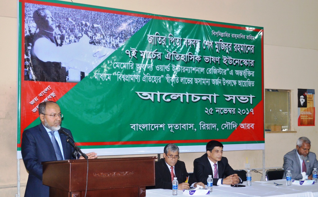 নিজস্ব প্রতিনিধি, বর্তমানকন্ঠ ডটকম, সৌদি আরব : জাতির পিতা বঙ্গবন্ধু শেখ মুজিবুর রহমানের সাতই মার্চের ঐতিহাসিক ভাষণ জাতিসংঘের ইউনেস্কোর বিশ্ব প্রামাণ্য ঐতিহ্যের স্বীকৃতি পাওয়ায় সৌদি আরবের রিয়াদে বাংলাদেশ দূতাবাসের উদ্যোগে