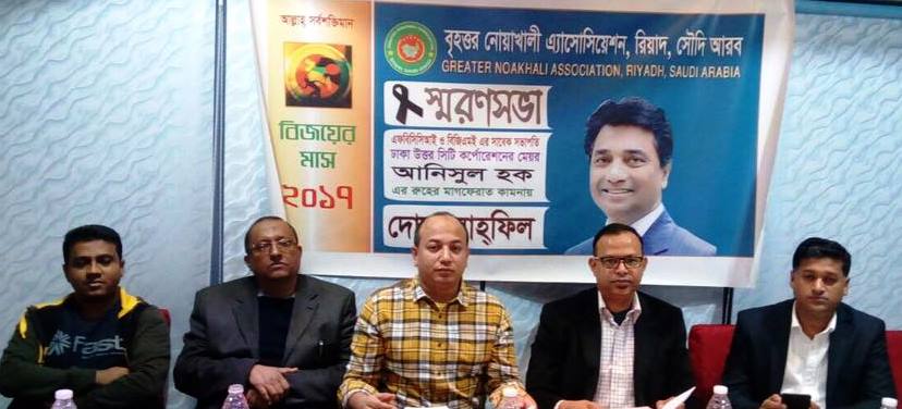 নিজস্ব প্রতিনিধি, বর্তমানকন্ঠ ডটকম, সৌদি আরব : ঢাকা উত্তর সিটি করপোরেশনের প্রয়াত মেয়র আনিসুল হক স্মরণসভা ও দোয়া মাহফিল করেছে রিয়াদ প্রবাসী বৃহত্তর নোয়াখালী এসোসিয়েশন। ১৫ ডিসেম্বর শুক্রবার রাতে সৌদি