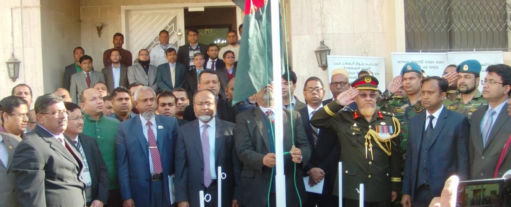 নিজস্ব প্রতিনিধি, বর্তমানকন্ঠ ডটকম, সৌদি আরব : যথাযোগ্য মর্যাদা ও আনন্দ উদ্দীপনার মধ্য দিয়ে সৌদি আরবের রিয়াদে বাংলাদেশ দূতাবাসে মহান বিজয় দিবস-২০১৭ উদযাপিত হয়েছে। এ উপলক্ষে সকালে দূতাবাস প্রাঙ্গনে জাতীয়