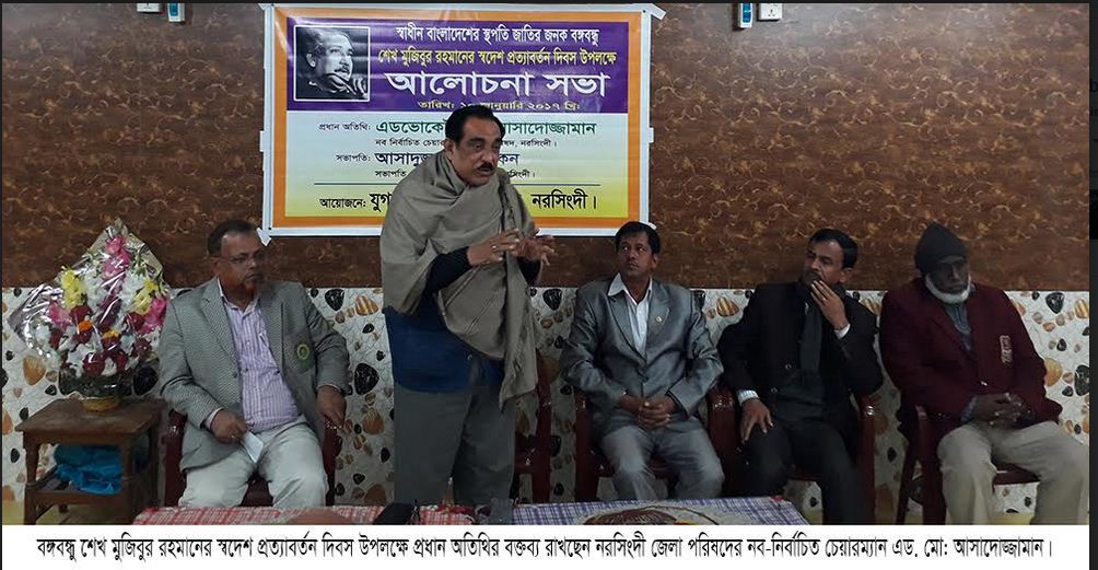 লক্ষন বর্মন,বর্তমানকণ্ঠ ডটকম: স্বাধীন বাংলাদেশের জাতির জনক বঙ্গবন্ধু শেখ মুজিবুর রহমানের স্বদেশ প্রত্যাবর্তন দিবস উপলক্ষে নরসিংদীর স্বজন সমাবেশ এর উদ্যোগে ১০ জানুয়ারি মঙ্গলবার সন্ধ্যায় শের-ই বাংলা ক্লাবের দ্বিতল ভবনে আলোচনা