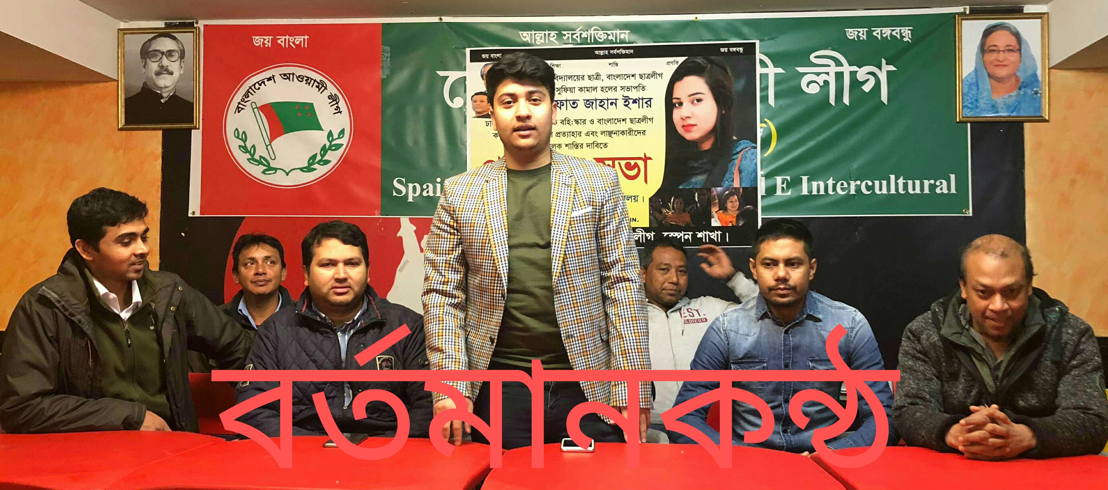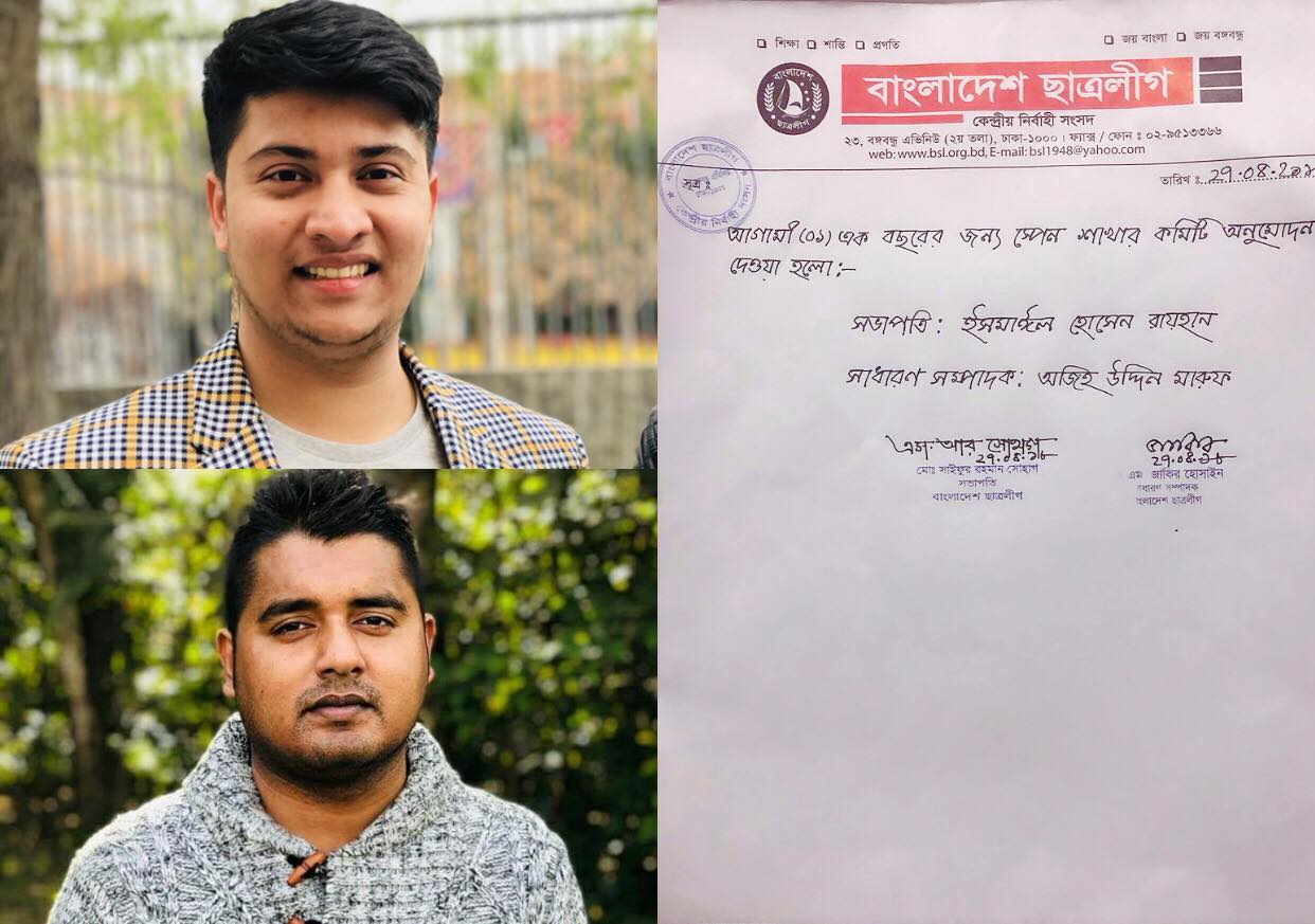 কবির আল মাহমুদ, বর্তমানকন্ঠ ডটকম, মাদ্রিদ, স্পেন: বাংলাদেশ ছাত্রলীগের স্পেন শাখার কমিটি গঠিত হয়েছে।স্থানীয় সময় গত (২৭ এপ্রিল ) শুক্রবার বাংলাদেশ ছাত্রলীগের সভাপতি সাইফুর রহমান সোহাগ এবং সাধারণ সম্পাদক এস
