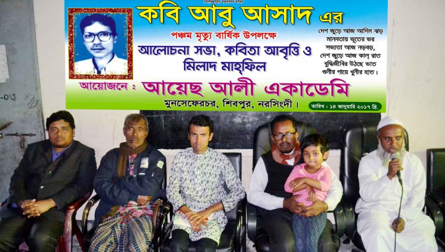 লক্ষন বর্মন,বর্তমানকণ্ঠ ডটকম: কবি আবু আসাদের পঞ্চম মৃত্যু বার্ষিকী উপলক্ষে শিবপুরের ইটাখোলায় প্রতিষ্ঠিত ঐতিহ্যবাহী শিক্ষা প্রতিষ্ঠান আয়েছ আলী একাডেমি কবিতা পাঠের আসর, আলোচনা ও দোয়া মাহফিলের আয়োজন করে। অনুষ্ঠানে সভাপতিত্ব করেন আয়েছ আলী একাডেমির প্রধান শিক্ষক মোহাম্মদ আজরাফ হোসেন। বক্তব্য রাখেন একাডেমির শিক্ষক সাহাদাৎ হোসেন, আবদুল কাদির, দৈনিক গ্রামীণ দর্পণের চীফ রিপোর্টার মোঃ জসিম উদ্দিন, মরহুম কবি আবু আসাদের ছোট ভাই মোঃ খোকন। দোয়া পরিচালনা করেন একাডেমির আরবী শিক্ষক ছিীদ্দকুর রহমান। আলোচনার পূর্বে কবি আবু আসাদের কবিতা আবৃত্তি করে মুনসেফেরচর মডেল বালিকা উচ্চ বিদ্যালয়ের ও আয়েছ আলী একাডেমীর ২১ জন ছাত্র-ছাত্রী। মুনসেফেরচর মডেল বালিকা উচ্চ বিদ্যালয়ের যেসব ছাত্র-ছাত্রীরা কবিতা আবৃত্তি করেছে তারা হচ্ছে, আছমা, আমেনা, মারিয়া। আর আয়েছ আলী একাডেমির যে ছাত্র-ছাত্রীরা কবিতা আবৃত্তি করেছে তারা হচ্ছে, সুমাইয়া, সাদিয়া, সানিয়া, শান্তা, শারমিন, আনিশা, ঐশি, লামিয়া আক্তার স্বর্ণালী, নুসরাত জাহান মোহনা, আফরিন, জেমিন, হাসি, শাহরিয়া আলম, যৌথ ভাবে স্বর্ণা, নাদিয়া, জান্নাতি, আফসানা, আবদুল্লাহ আল মাহি, তামজিদ, হোসাইন মুহাম্মদ আফিফ।