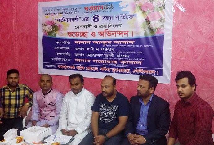 বেলাল উদ্দিন, বর্তমানকন্ঠ ডটকম, মদিনা, সৌদি আরব : দেশ বিদেশের মানুষের বিশ্বস্ত মুখপত্র জনপ্রিয় অনলাইন নিউজ পোর্টাল বর্তমানকন্ঠ ডটকমের ৪ বছর পূর্তিতে আলোচনা সভা করেছে বর্তমানে কন্ঠের সৌদিআরব মদিনা পাঠক ফোরাম। মদিনা বাংগালী মার্কেটে আয়োজিত সভায় সভাপতিত্ব করেন ম্যাগপাই ফুড প্রোডাক্টস লিমিটেডের চেয়ারম্যান ছরোয়ার কামাল।